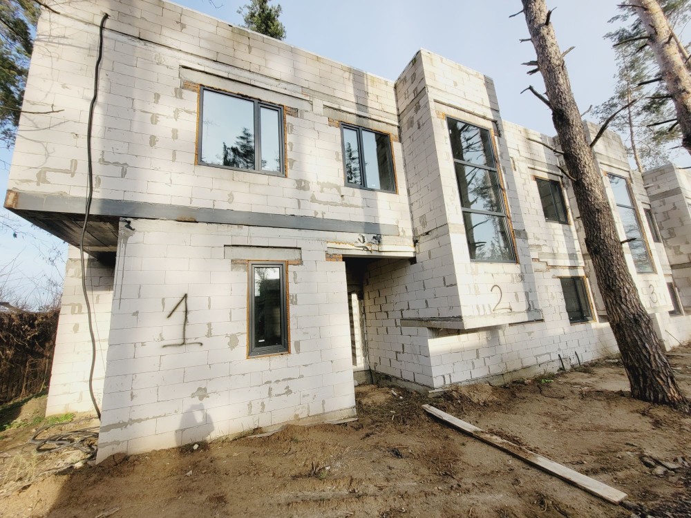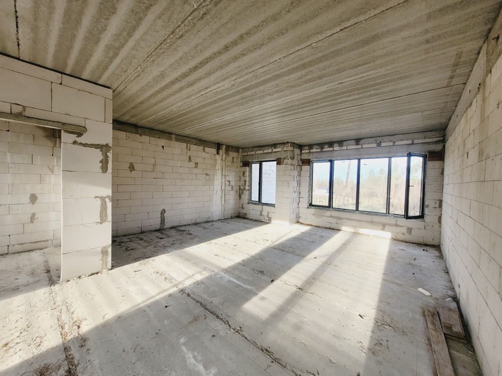 Будинок знаходиться на земельній ділянці в 10 соток. Земельна ділянка приватизована, має прямокутну форму 25 на 40 м, майже горизонтально рівна, різниця по діагоналі складає не більше 30 см по висоті. Будинок має монолітний армований ленточный фундамент. При армуванні фундаменту та стін використовувалась арматура 1,2 см. Стіни виконані з пеностирольних блоків де всередину вставлена арматура і залита бетоном. Перекриття між першим та другим поверхом та горищем виконано з дерев'яних балок 20 на 30см. Будинок покритий металочерепицею. стоять металопластикові вікна та технічні вхідні двері. На земельній ділянці знаходиться приватна водяна скважина та заведена вода в будинок. Будинок підключений до зовнішнього електропостачання з величиною прогнозованої приєднаної потужності 7 кВт напруга приєднання 380 B. Зовнішній розмір будинку по ширині складає 11,5 м, по довжині 13,4 м. Жила площа першого поверху складає 127,29 м². З них кухня складає 32,63 м², зала складає 36,47 м², кімната складає 23,13 м², туалет складає 11,52 м² 52, коридор займає 23,54 м². Висота стелі 3 м. Другий поверх мансанровий, де по площі підлоги має таку саму квадратуру 127,29 м², як і перший поверх, але в кожній висота однієї зовнішньої стіни складає 1,75 м за рахунок нахилу даху. Розташування кімнат ідентичне до першого поверху. Висота стелі 2,75 м. За рахунок пеностирольного покриття стін сам будинок дуже є енергозберігаючим і потребуватиме невеликі витрати на обігрів. Oбігрів будинку планувався електричний, так як будинок має низьку втрату тепла, але і можливі інші варіанти обігріву, такі як газ або комбінації дров'яного каміну та електрообігріву. Газопровід іде по вулиці. За рахунок великих вікон будинок отримує достатньо багато сонця і кімнати всі світлі. Великі кімнати та коридори дають багато креативного простору, щоб створити житло яке підходить власне для вас. Контактні дані WhatsApp: +4917630793718 Email: skorba-oleg@ukr.net Oleg