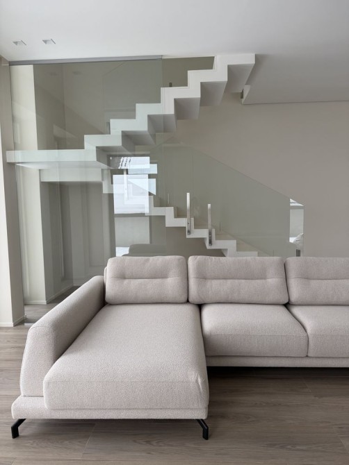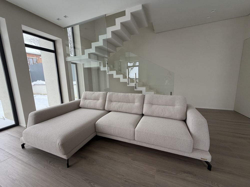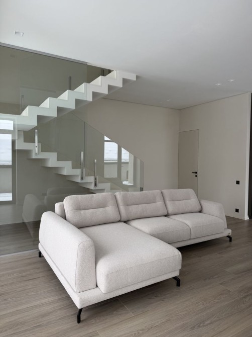 Головним акцентом будинку є панорамні вікна від підлоги до стелі, які наповнюють простір природним світлом і відкривають приємний вид на подвір’я або зелену зону. Завдяки цьому інтер’єр виглядає просторо й легко, а межа між внутрішнім і зовнішнім простором майже зникає.