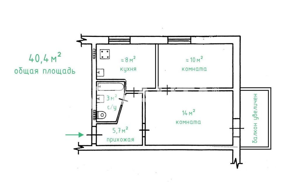 • Общая площадь 40.4 м2