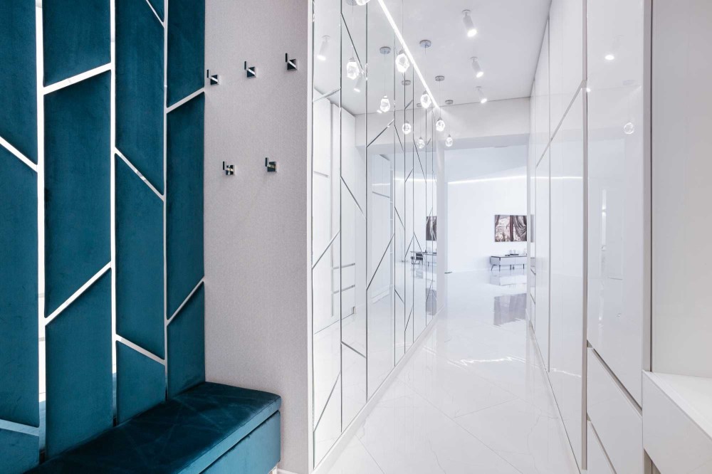 Натяжні стелі із сучасним тонованим освітленням.