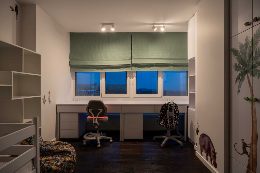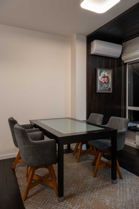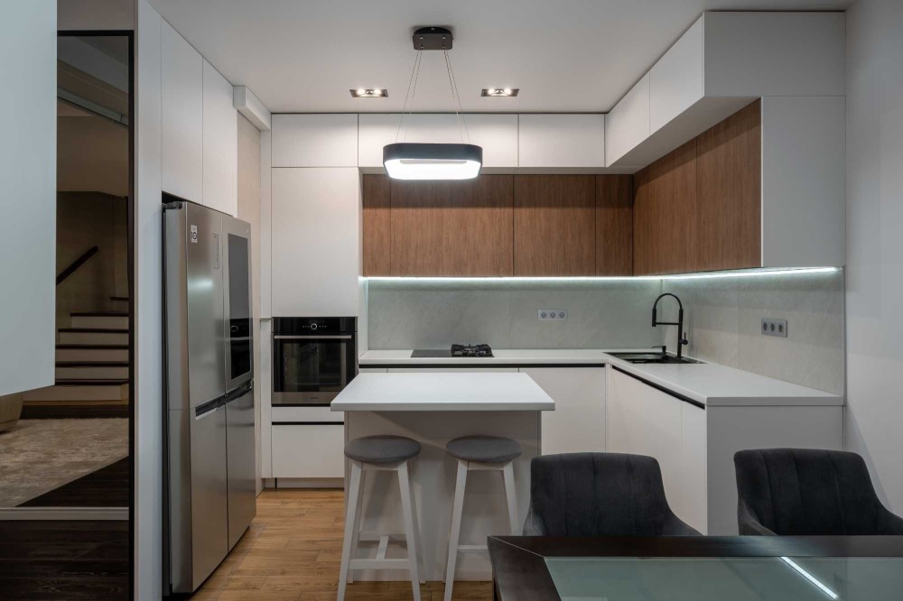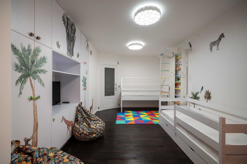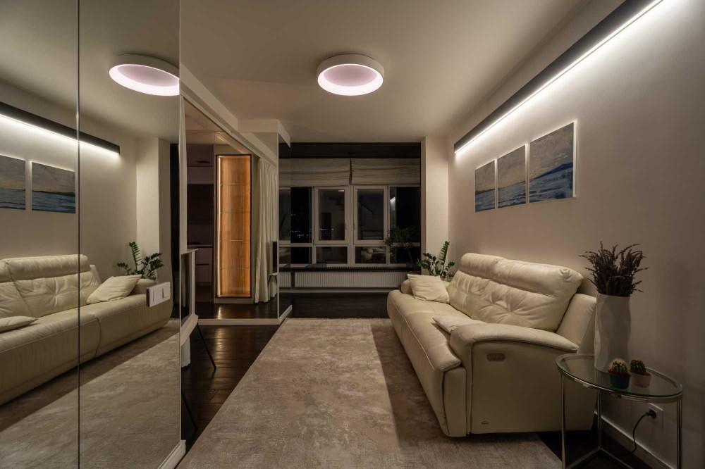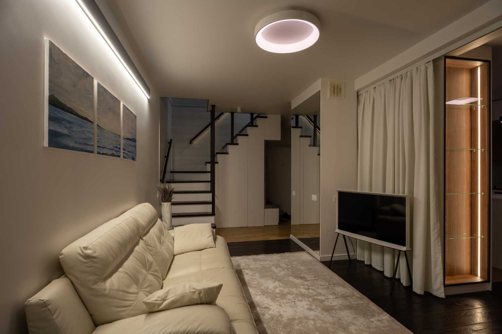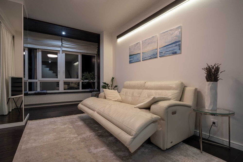 Зона вітальні облаштована дизайнерським телевізором Serif та шкіряним диваном з реклайнером. Кухня виконана з панелей AGT (як і решта меблів), фурнітурою Blume, посудомийною машиною grohe, холодильником lg door in door та роздрібнювачем відходів, а також потужною витяжкою. В санвузлах встановлена сантехніка Hansgrohe, унітази roca, пральна та сушильна машина samsung, а меблі з вологостійкого фарбованого МДФ.