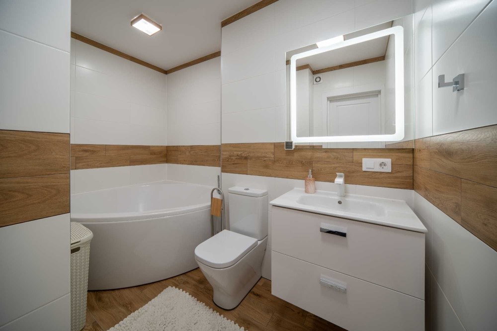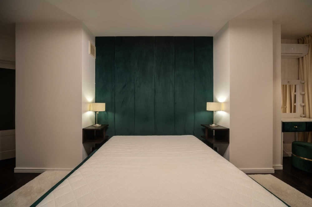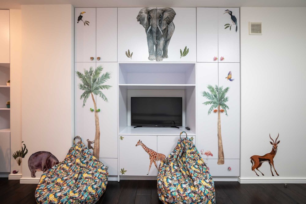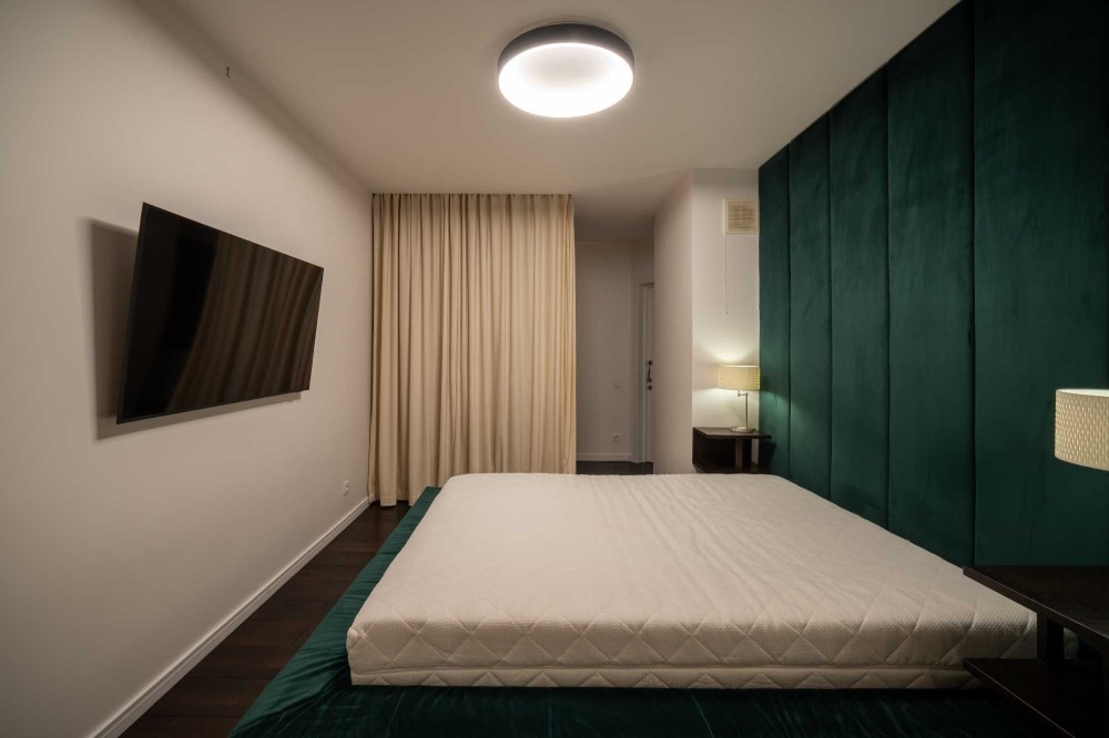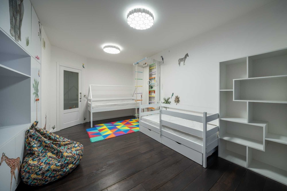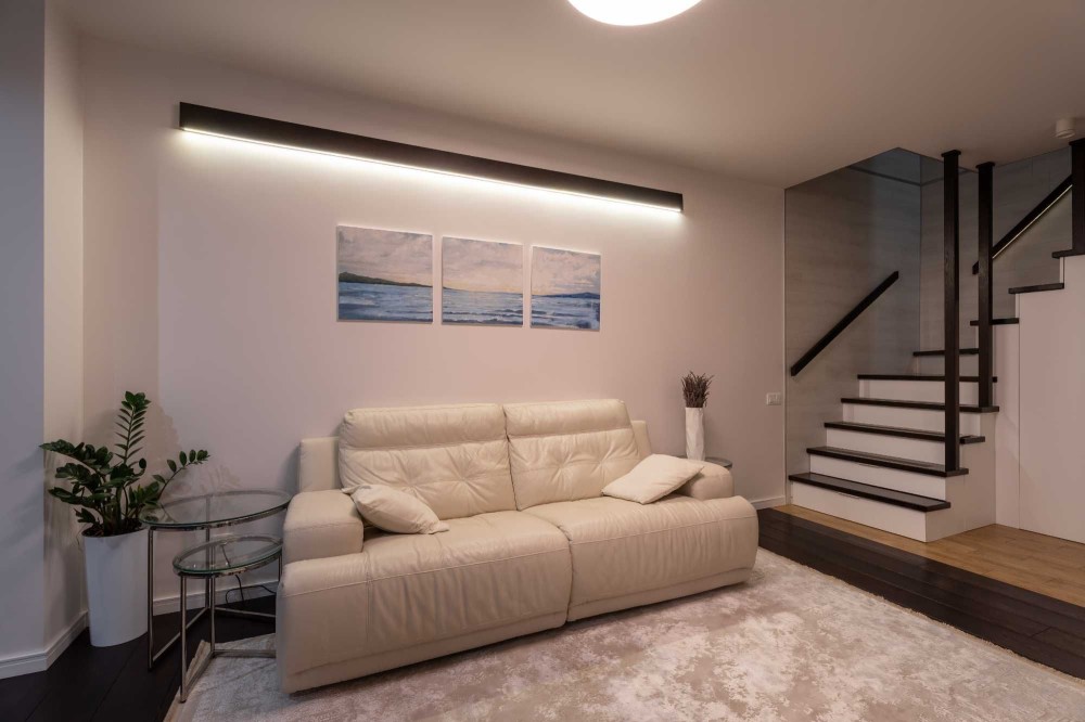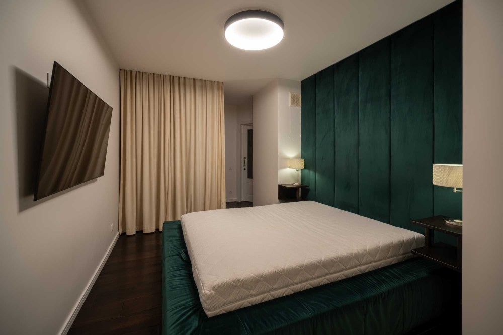 Зона вітальні облаштована дизайнерським телевізором Serif та шкіряним диваном з реклайнером. Кухня виконана з панелей AGT (як і решта меблів), фурнітурою Blume, посудомийною машиною grohe, холодильником lg door in door та роздрібнювачем відходів, а також потужною витяжкою. В санвузлах встановлена сантехніка Hansgrohe, унітази roca, пральна та сушильна машина samsung, а меблі з вологостійкого фарбованого МДФ.