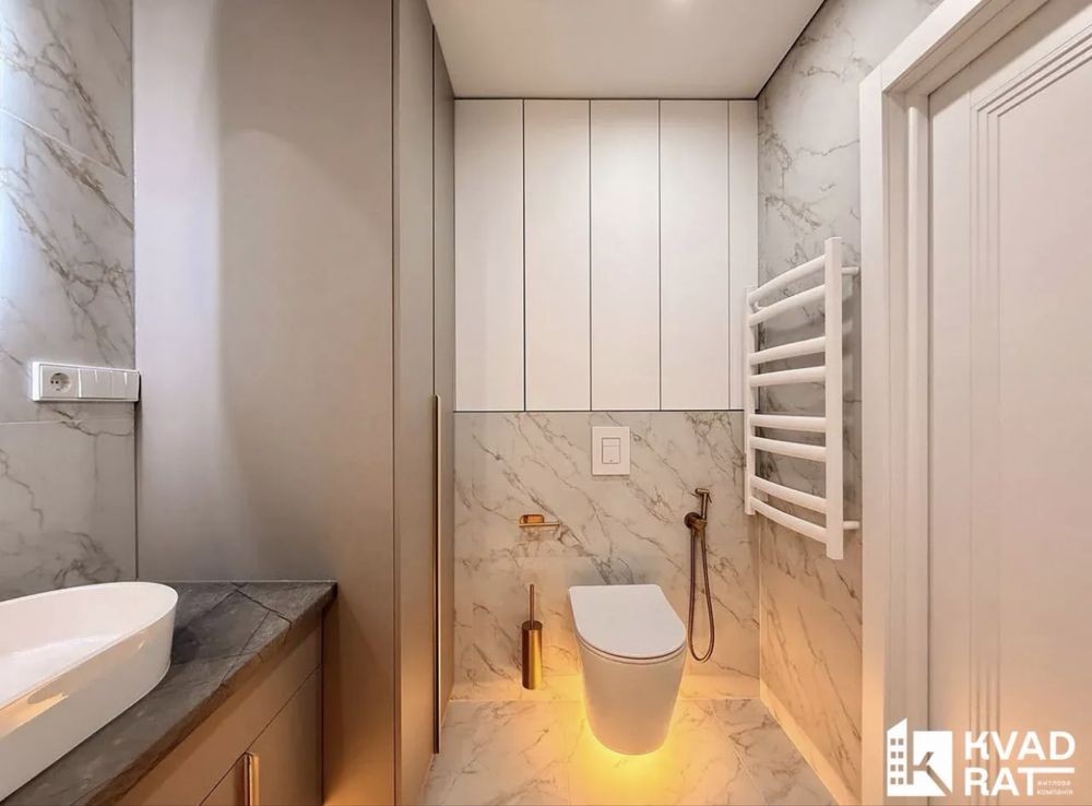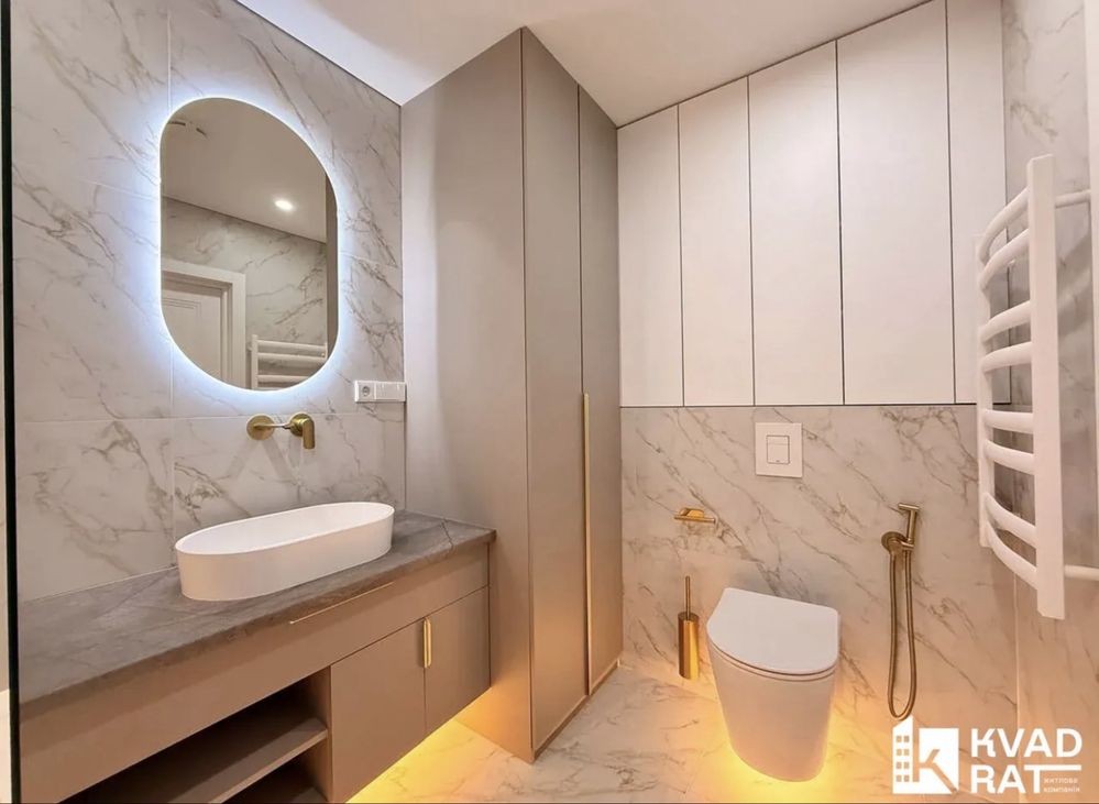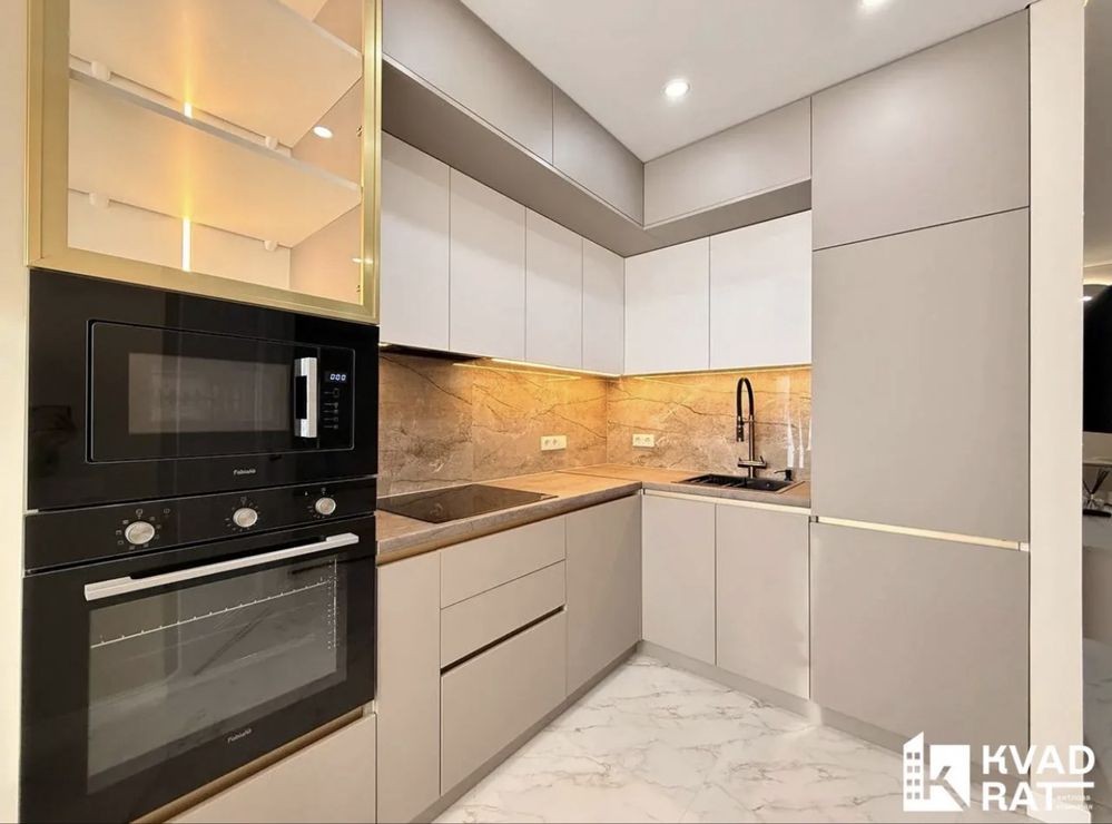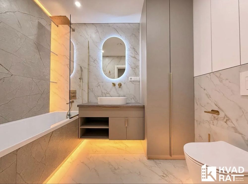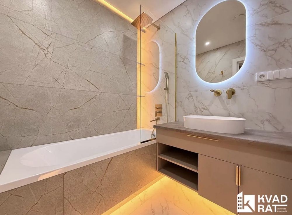 Інтерєр виконано у стриманій сучасній палітрі з використанням якісних матеріалів кварц-вініл, керамічна плитка, фарбовані стіни, продумане LED-освітлення.