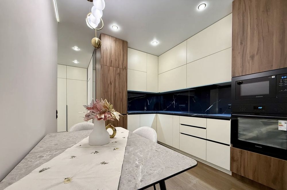 У квартирі виконаний якісний ремонт з використанням виключно дорогих матеріалів. Є вся необхідна техніка: холодильник, посудомийка, духовка, мікрохвильова піч, індукційна варильна поверхня, телевізор Samsung. Квартира ідеально спланована: є простора кухня-студія з невеликою кладовою, велика батьківська спальня з власним вмістким гардеробом та простора прихожа.
