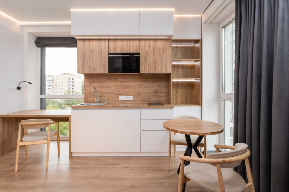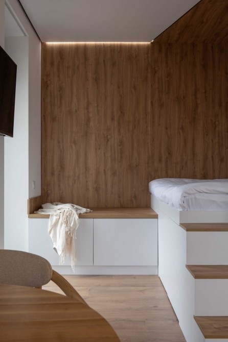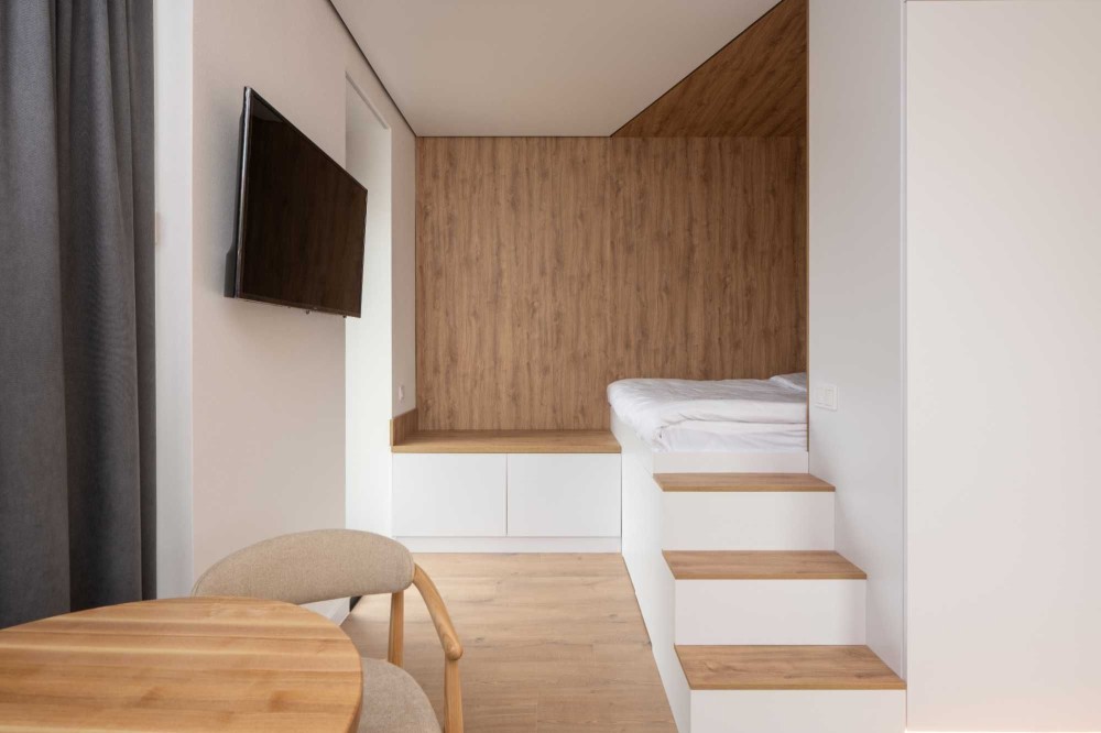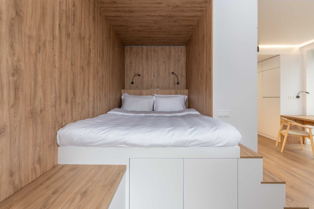 Апартаменти мають необхідні меблі для комфортного проживання: широке двоспальне ліжко з ортопедичним матрацом, а також робоча зона зі стільцями та шафа для розміщення особистих речей.