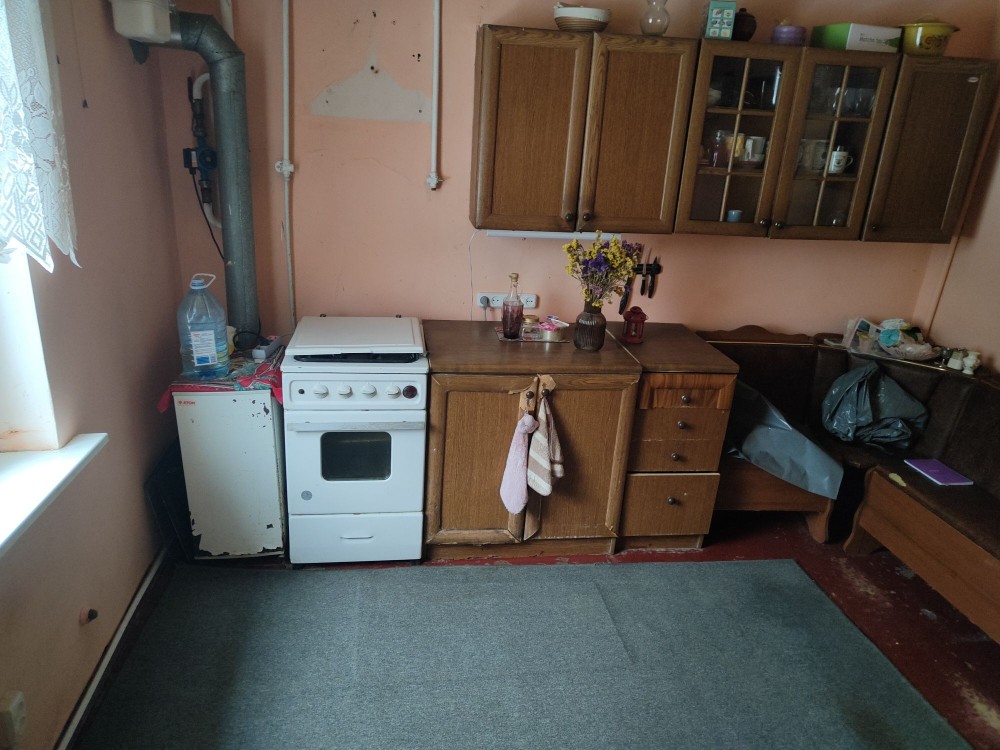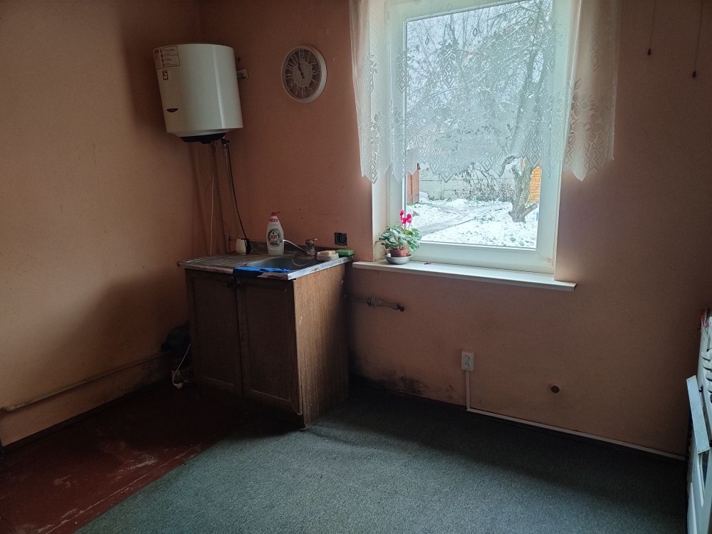 Дом в с.Заболотье, Шосткинский район. Общий вид с огорода (фото 1) Слева деревянный сарай ~ 24м2 (фото 2) Возле сарая погреб (фото 3) Летняя кухня ~ 10м2 (фото 4) Возле летней кухни есть скважина под глубинный насос (фото 5) Жилой дом ~ 50м2 (фото 6) Прихожая (фото 7-8) Коридор (фото 9) По коридора прямо сразу веранда (фото 10-11) Налево по коридору проходная комната с половиной грубки, двумя столами и счетчиком электроэнергии (фото 12-15), дальше комната со второй половиной грубки (фото 16-19) Направо по коридору кухня с печкой и лежаком (фото 20) Пол везде хороший. Долгов нет. Есть сад и плодовые деревья. Состояние все на фото.