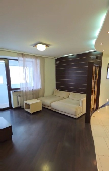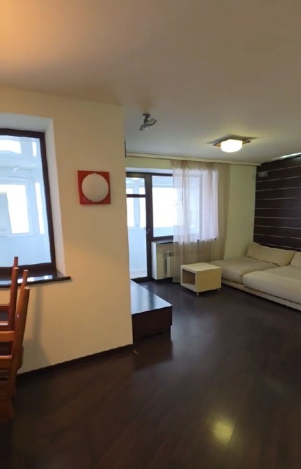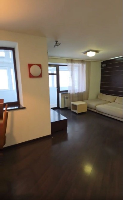 Меблі та побутова техніка в квартирі. Простора вітальня з диваном та столом. Наявність вікна та освітлення створюють затишну атмосферу.