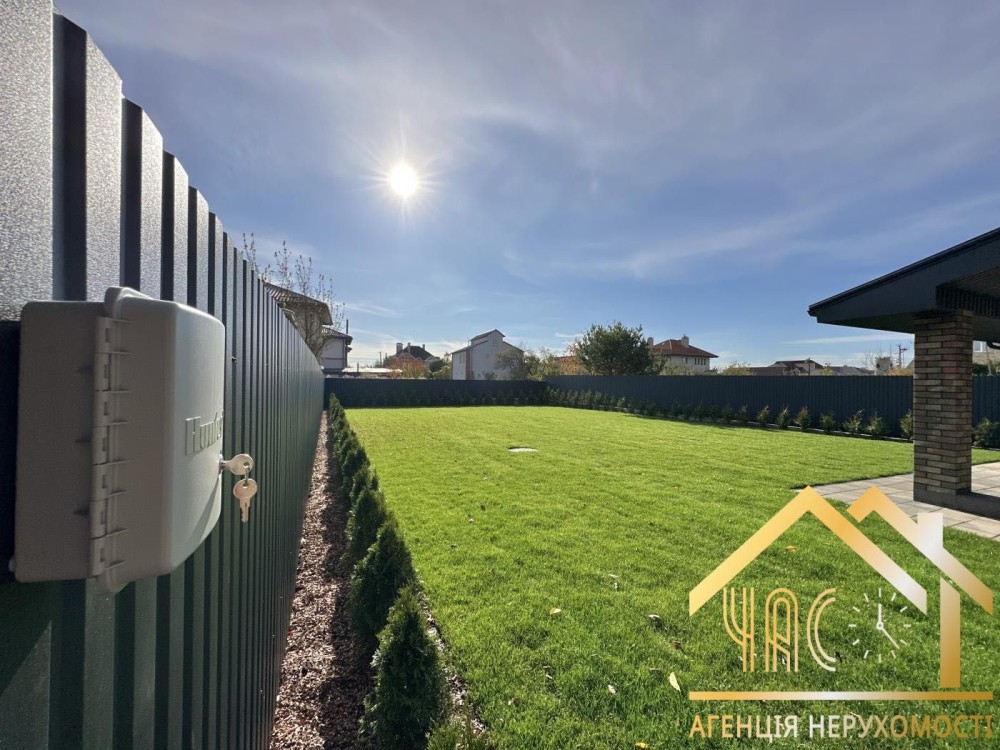 Земельна ділянка 7,3 соток, з повним благоустроєм та професійним озелененням: рулонний газон, автоматичний полив, зручний заїзд і зона відпочинку.