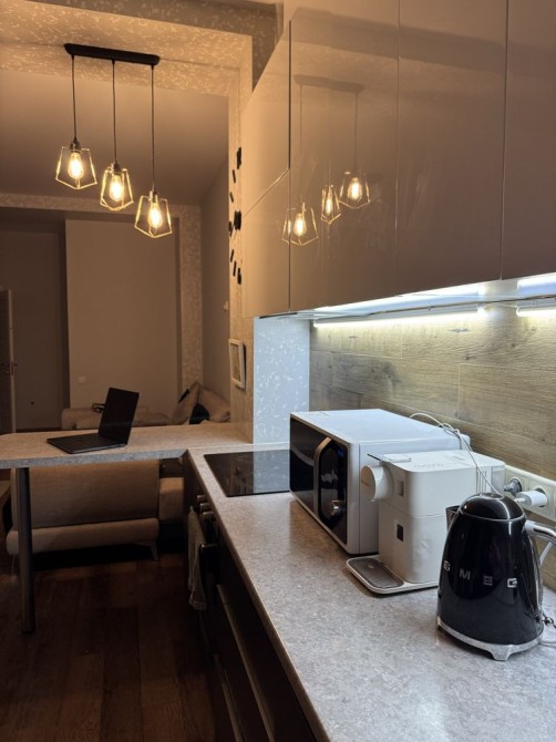 Кухня и гостиная объединены в большое светлое пространство с барной стойкой и обеденной зоной. Вся техника — брендовая и дорогих европейских производителей: варочная поверхность, микроволновка, холодильник, кофемашина, стиральная и сушильная машины , всё сделано не под аренду, а для себя.