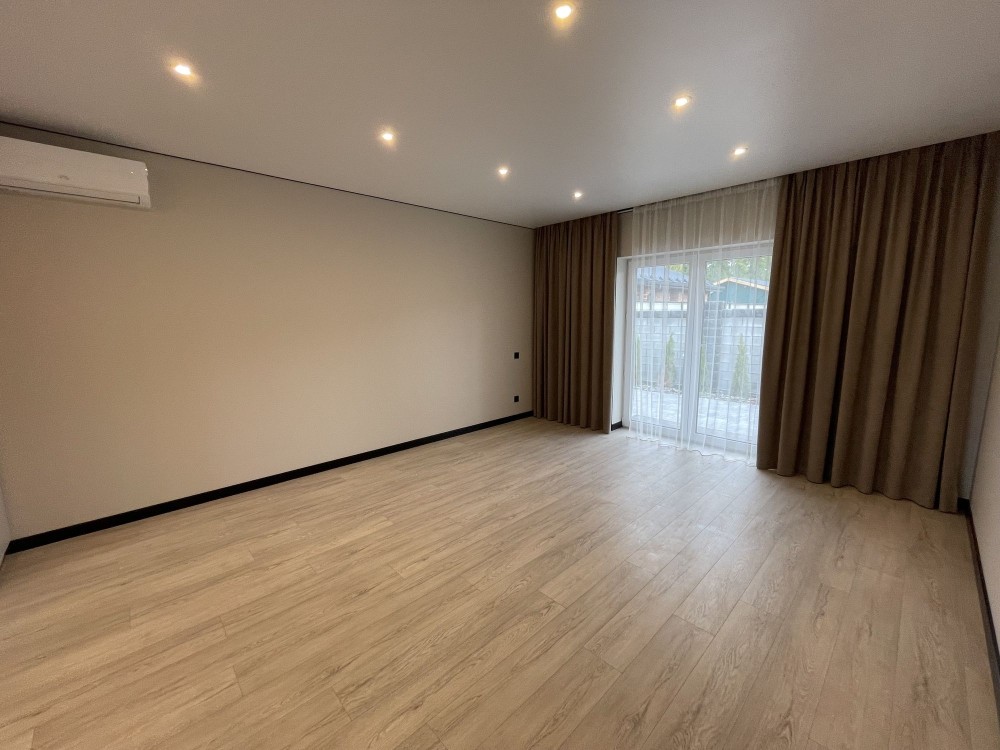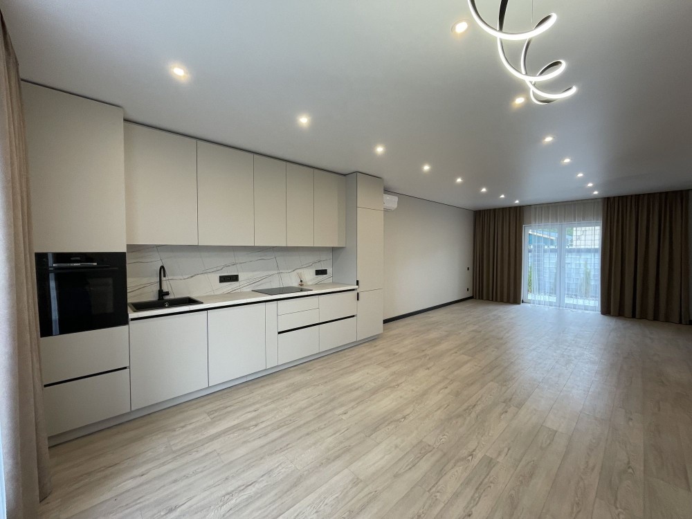 Планування: три окремі кімнати, кухня-вітальня з виходом на задній двір. У будинку зроблено новий якісний ремонт. Кухня укомплектована вбудованими меблями та технікою: варильна поверхня, витяжка, духовка, холодильник. Встановлено кондиціонер. Санвузол роздільний, є душова кабіна та пральна машина. По всій площі будинку прокладена тепла підлога. Кімнати без меблів.
