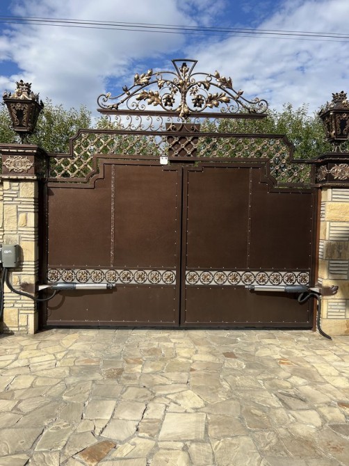 ковані ворота (на пульту) та калітка, забор з каменю, бесідка