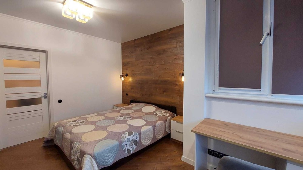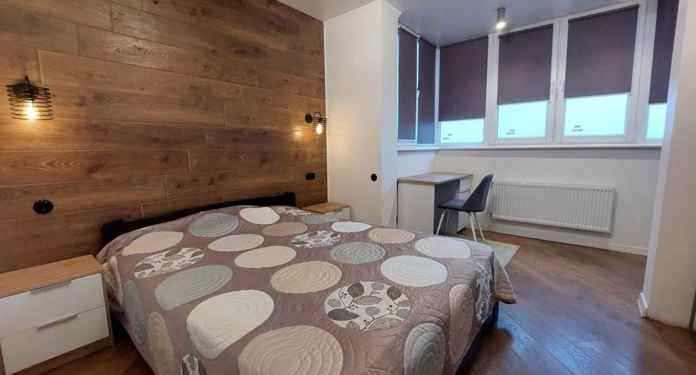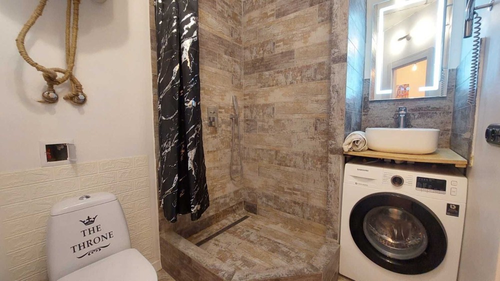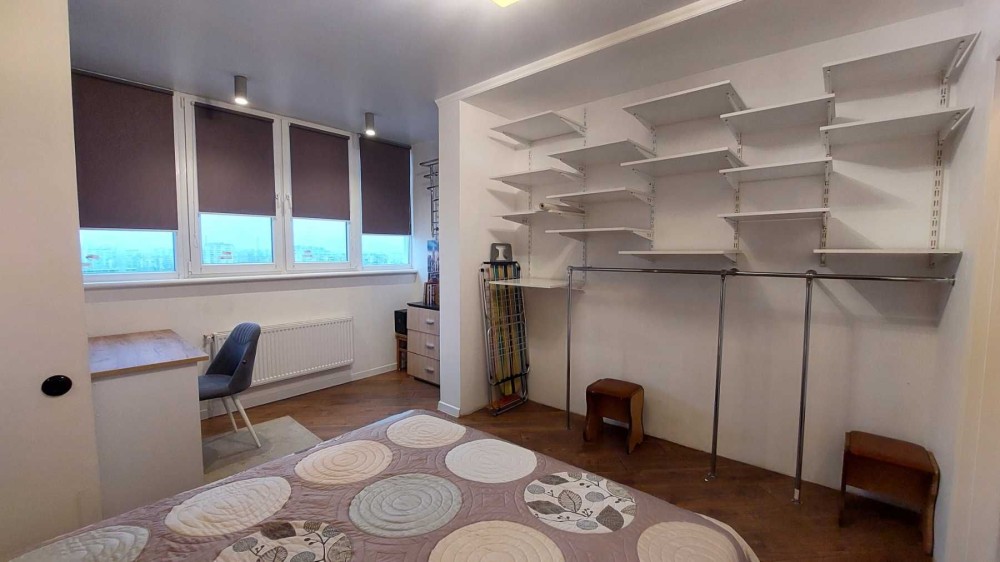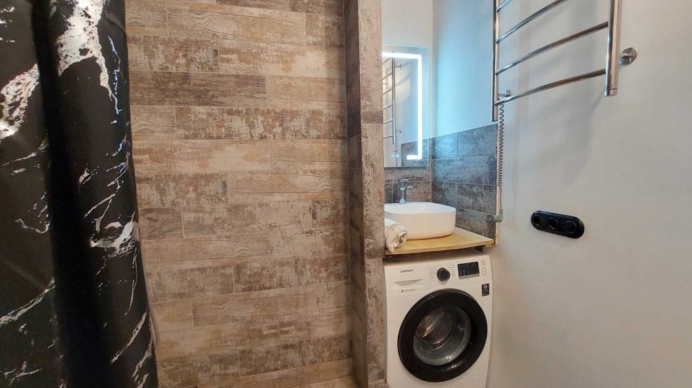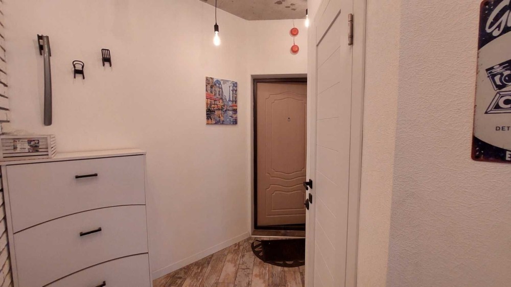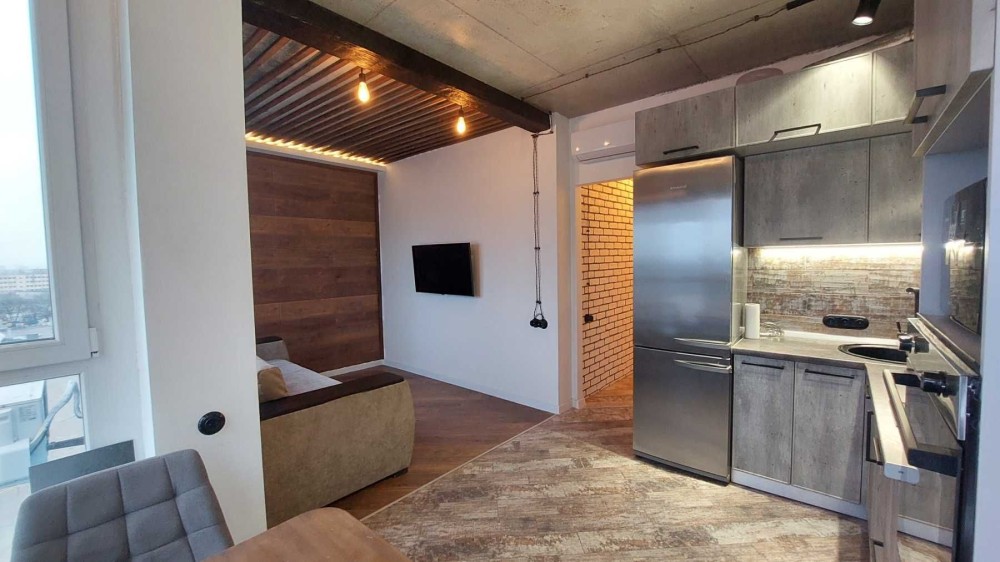 Удобная планировка: студия и отдельная спальня, совмещенный санузел.
