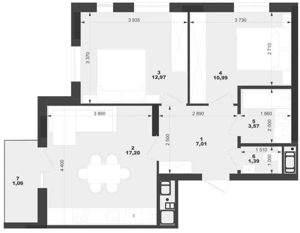 • Трехкомнатная