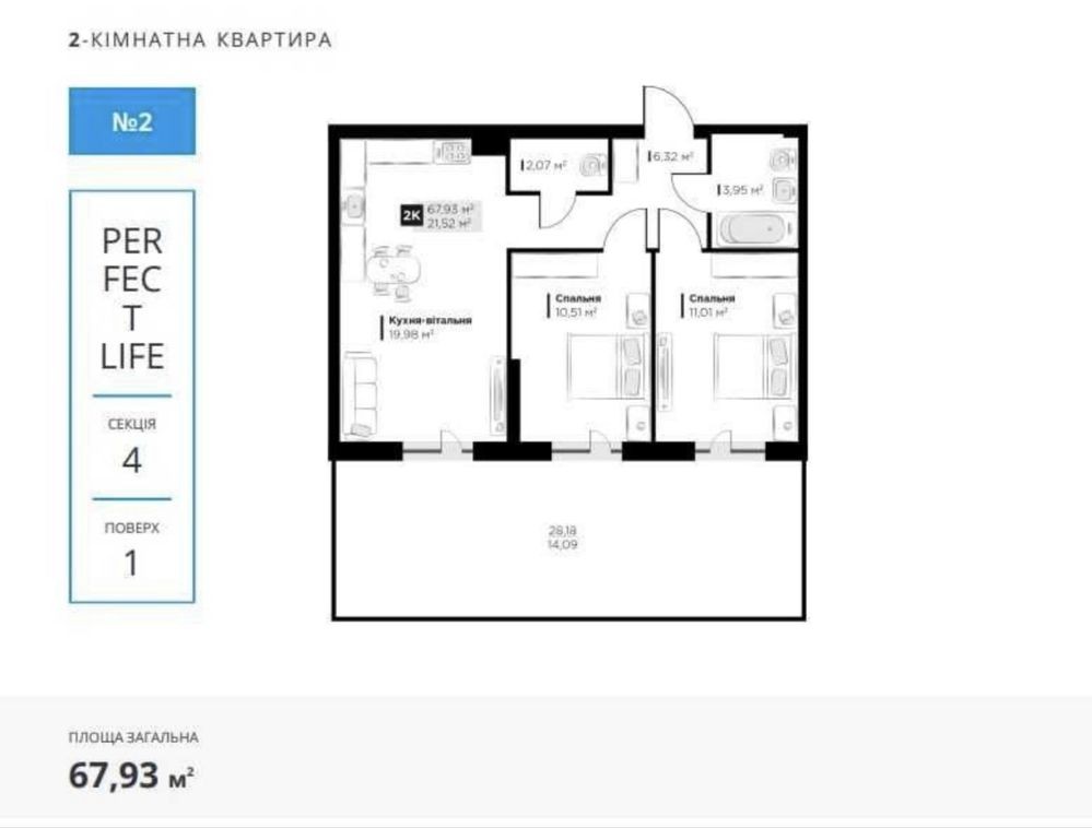 Продається 2-кім. квартира з патіо в ЖК Perfect Life ( Винники, вул.Галицька ). Гарний вид з вікна на відпочинкову зону, квартира сонячна та затишна. Загальна площа 67,93 кв.м, простора кухня-вітальня 19,98 кв.м. з виходом на патіо, встановлено розсувні енергоефективні системи. Дві ізольовані спальні кімнати. Два санвузли: ванна кімната 3,95 кв.м. та 2,07 кв.м. Індивідуальне опалення - 2контурний газовий котел, батареї. Будинок збудований, в підʼїздах закінчений ремонт, здача будинку з дня на день. ЖК бізнес-класу, малоповерховий проєкт у лісопарковій зоні з ексклюзивними дизайнерськими холами та закритою територією подвір'я. Квартири з патіо – це нові можливості проведення часу з насолодою, де можна облаштувати зону відпочинку, барбекю зону, зону для дітей, спорту або елегантний сад. Закритий двір без авто, дитячий майданчик та дворівневий підземний паркінг, поруч багато комерції.