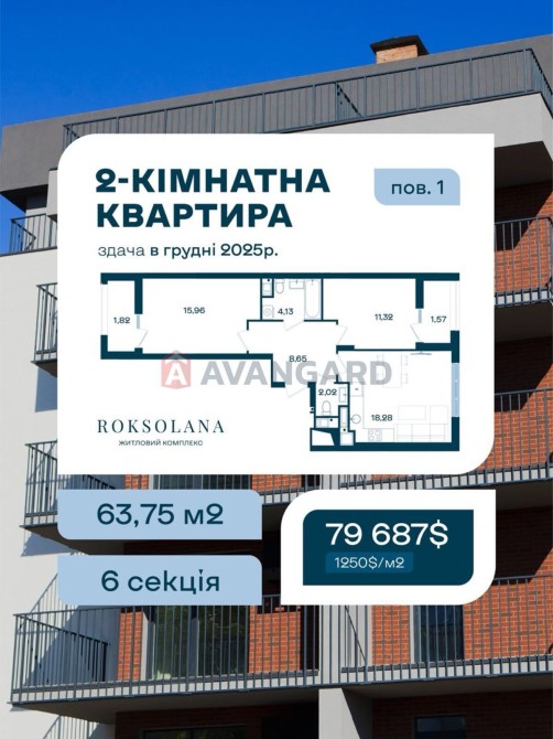 Загальна площа - 64 м2, знаходиться по вулиця Роксоляни, 30 ЖК Роксолана