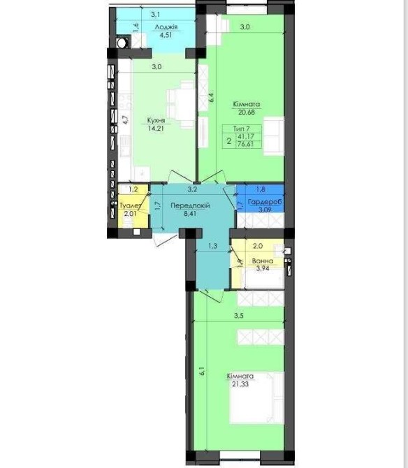 •Розташована квартира на 6-му поверсі, площею 76.61 кв.м.