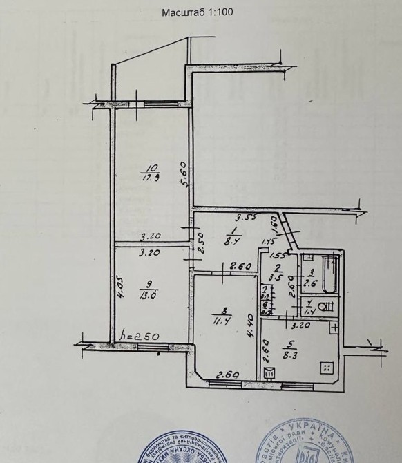 Кімнати - 11,4 м.кв., 13 м.кв. та 17,9 м.кв., кухня - 8.3 м.кв., санвузол роздільний, коридор - 8,4 м.кв. + 3,5 м.кв.