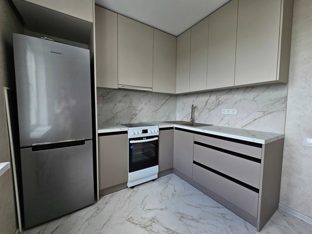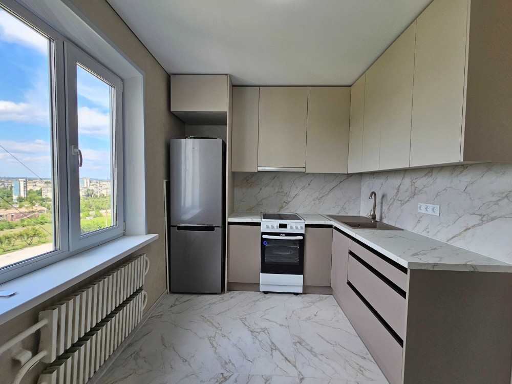 На кухне — новая кухонная мебель, холодильник, плита. На полу плитка. Из окна открывается красивый вид.