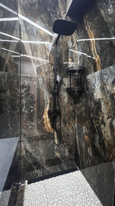 •Санузел: инсталляция, тропический душ с вылитым поддоном и коленным стеклом, раковина и столешница из керамогранита.
