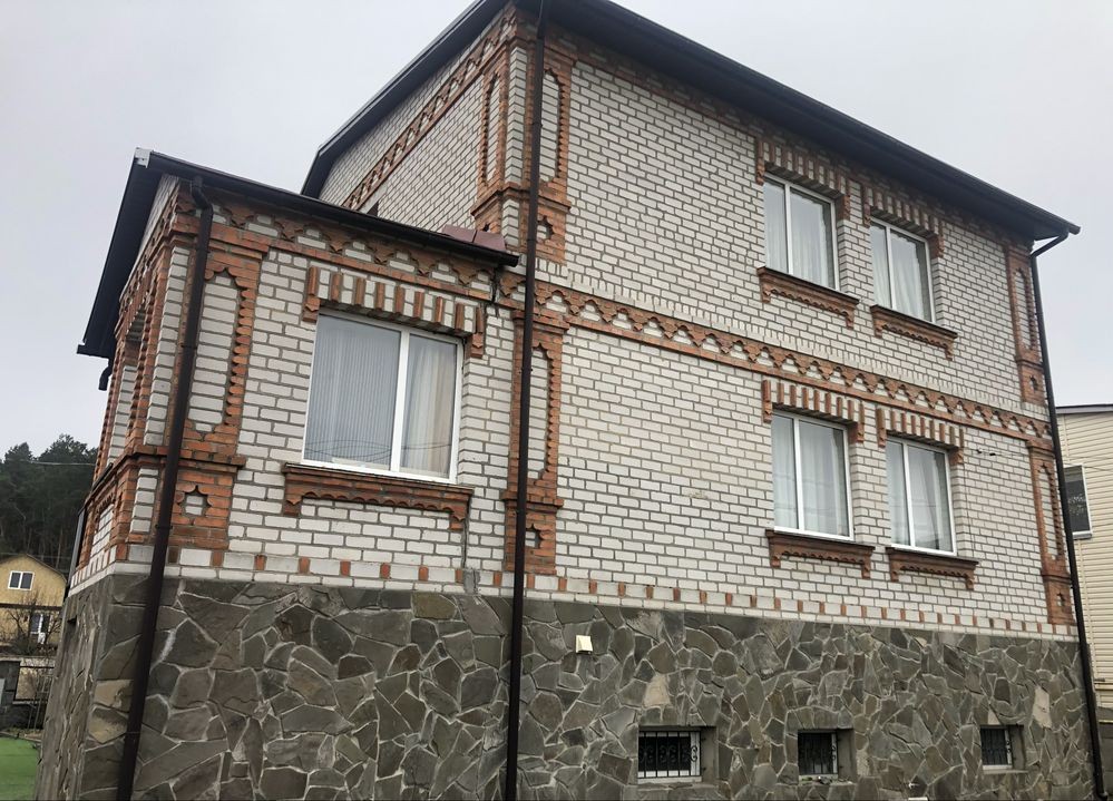 Будинок з бетонним перекриттям. Загальна площа 243.3 м.кв., житлова 68,7 м.кв . Опалення: електро, газове, твердопаливне. Знаходиться в мальовничому районі біля лісу, поруч річка. Два верхніх поверхи житлові, в цокольному є гараж, окрема мебльована кухня, котельня, льох, комора.