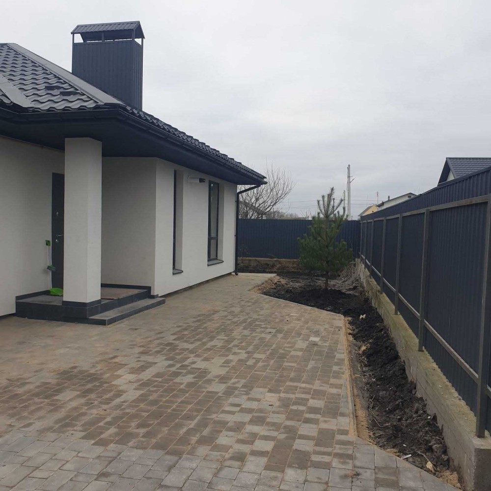 Двір бруківка, паркан попериметру.