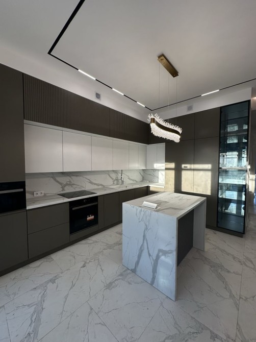 Сучасна дизайнерська кухня, з вмонтованою технікою, оснащенна посудомийкою і встановлений подрібнювач на кухні