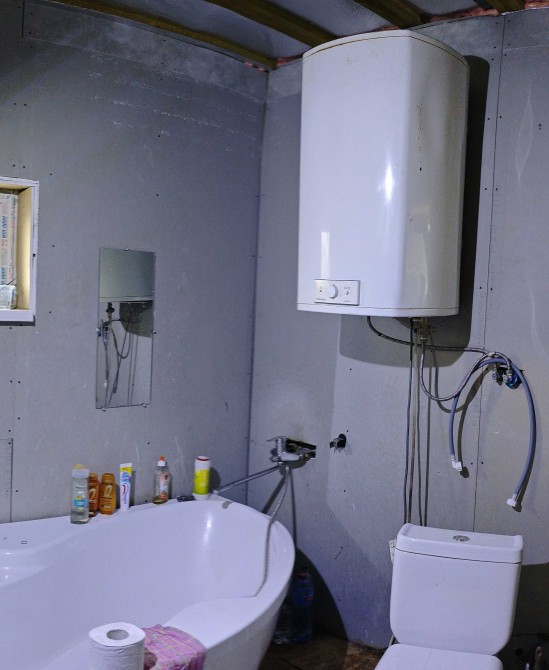 Общая площадь — 148 м²: первый этаж 58 м², второй 90 м². Первый этаж требует ремонта, второй — с незавершенным ремонтом. В доме пять комнат, два совмещенных санузла, электрическое отопление. Все коммуникации подключены — свет, вода, газ.