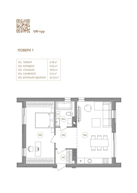 - Передпокій, простора кухня-студія, ванна кімната та спальня;