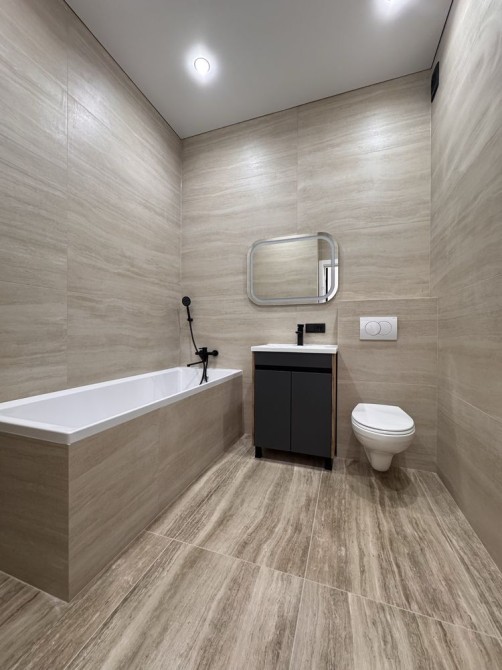 — Санвузол з ванною, пральною машиною та сучасною плиткою.