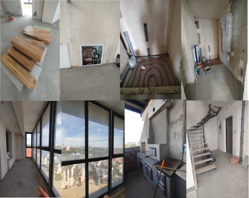 Квартира оснащена індивідуальним опаленням — встановлено котел, а також вимуровано камін і піч, що створює додатковий комфорт та затишок. Проведено електропроводку, встановлено сантехніку, облаштовано теплу підлогу, змонтовано міжповерхові сходи. Стіни вирівняні та готові під фарбування.