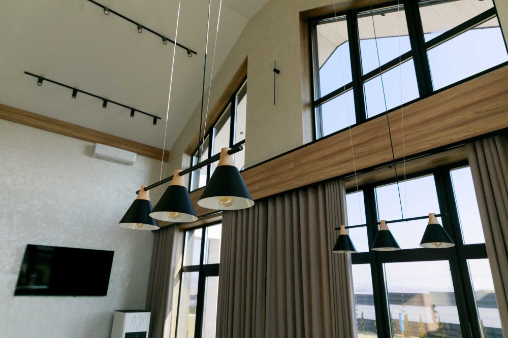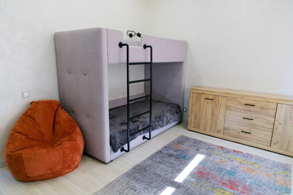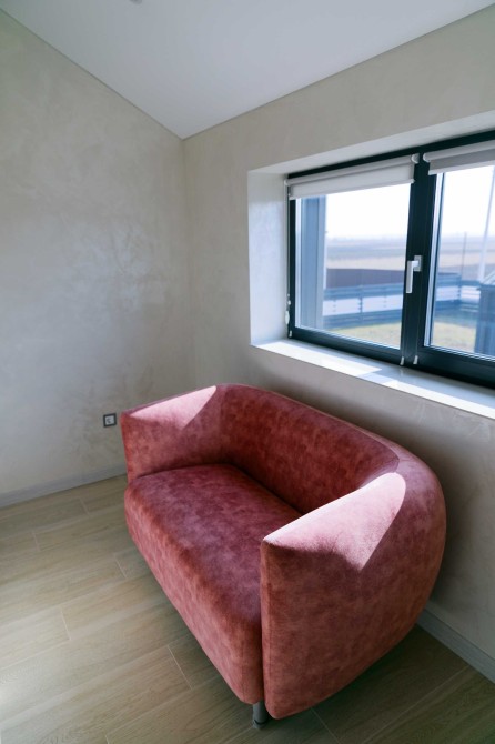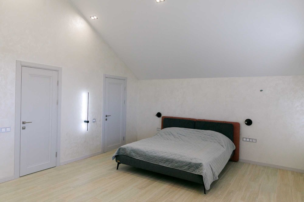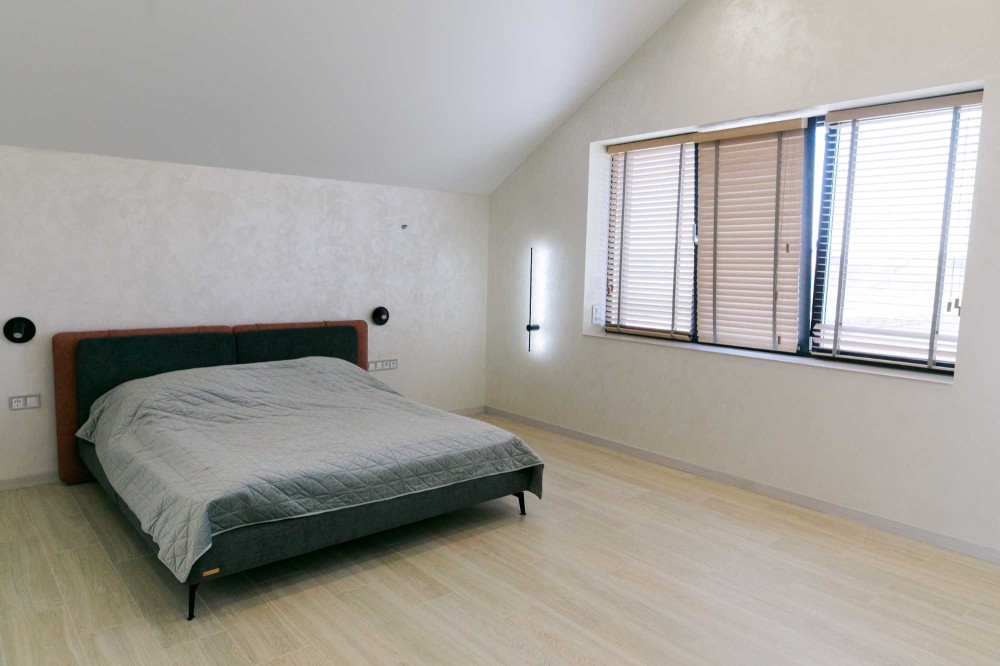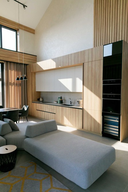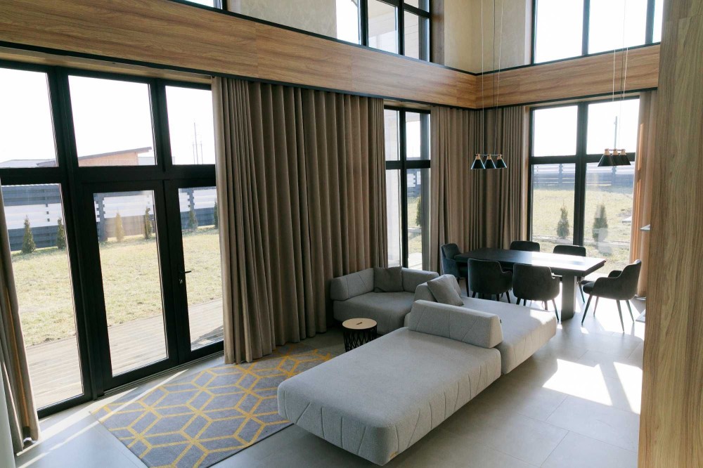 3 окремі спальні, кухня-студія з каміном, 2 санвузли, гардеробна та техприміщення. Усі необхідні меблі та техніка. Висота стелі у вітальні – 9 метрів!