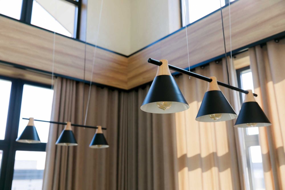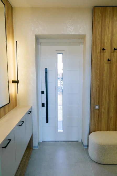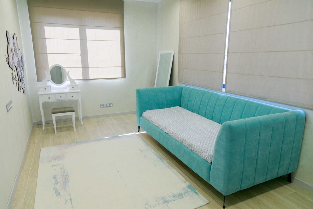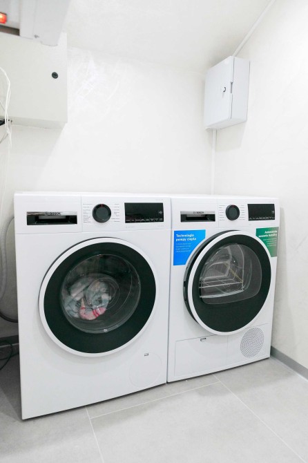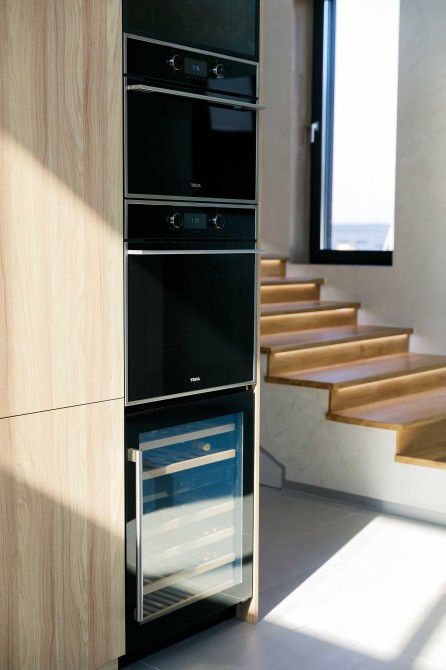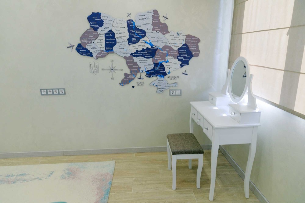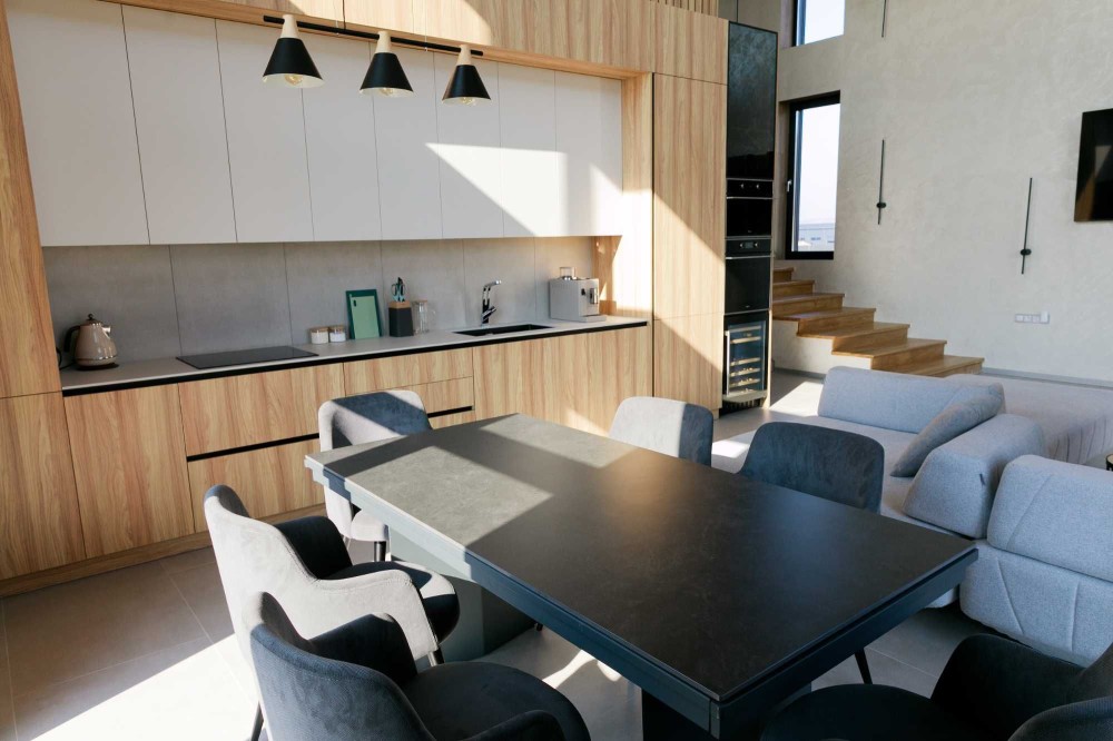 3 окремі спальні, кухня-студія з каміном, 2 санвузли, гардеробна та техприміщення. Усі необхідні меблі та техніка. Висота стелі у вітальні – 9 метрів!