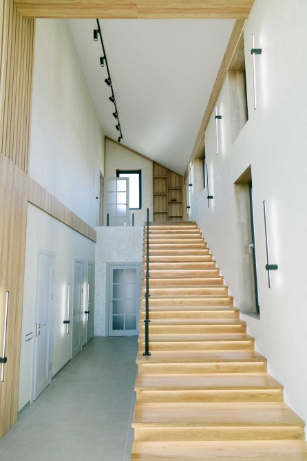 Будинок в стилі «Барнхаус», фасад будинку оздоблений словацьким клікфальцем у кольорі «графіт» та українським планкеном з смереки. Простора тераса, що викладена з модрини, виходить на схід. Будинок під’єднаний до електромережі 25 кВт та міського водопроводу. У будинках встановлено електричні котли, що в поєднанні з двозонними лічильниками є найдешевшим варіантом опалення. В якості альтернативного джерела опалення закладено комунікації під твердопаливну піч-камін. Вікна семикамерні із тришаровим склопакетом, що вкритий УФ-відбиваючим напиленням.