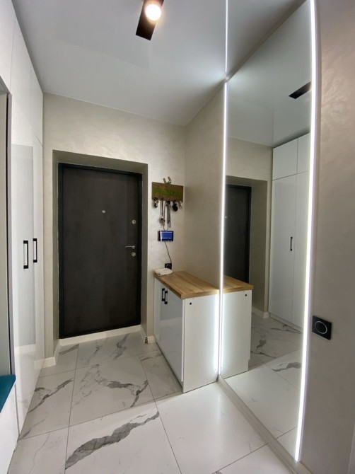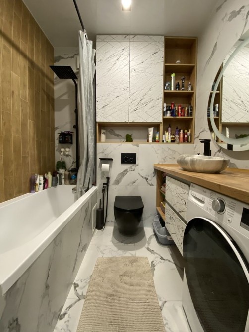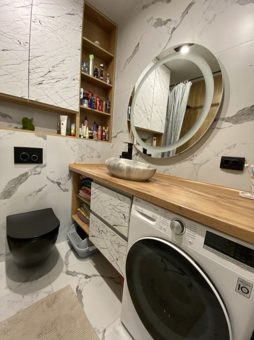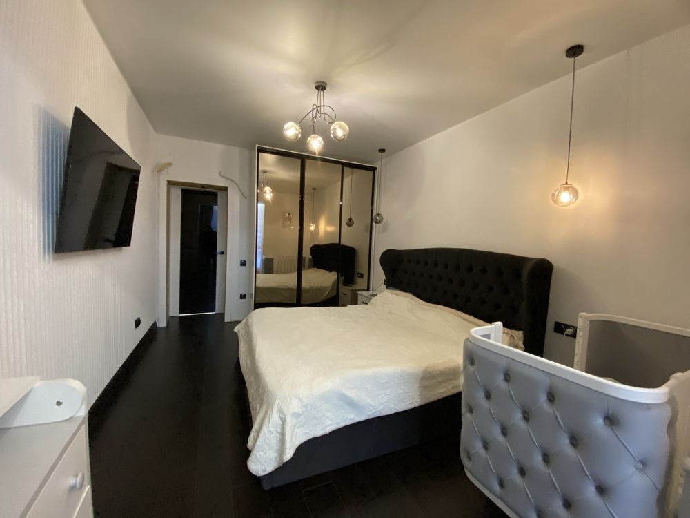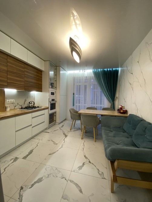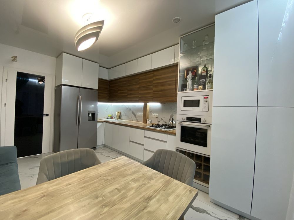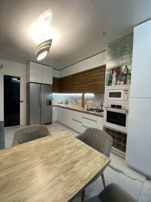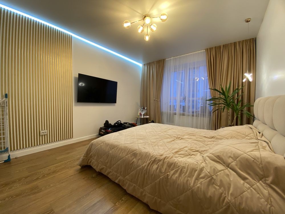 Квартира повністю готова до проживання — ремонт виконано з дорогих матеріалів, встановлені меблі та вся необхідна побутова техніка: посудомийна машина, холодильник, варильна поверхня, духова шафа, мікрохвильова піч, пральна машина, витяжка.