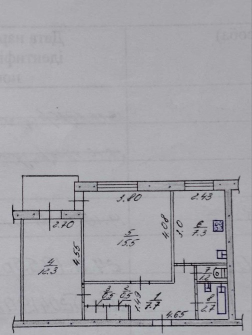 1 кім.- 12.3 2-га кім. - 15.5 Кухня: -7.3 м² Туалет - 1.2, новий бойлер. Ванна - 2.7