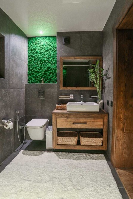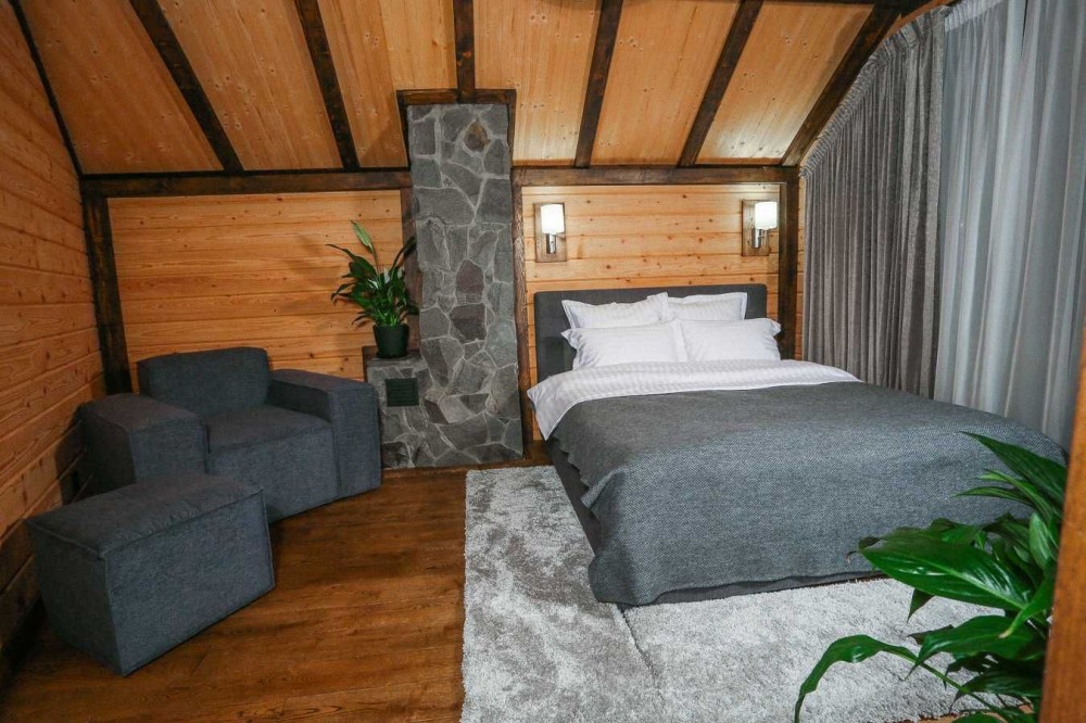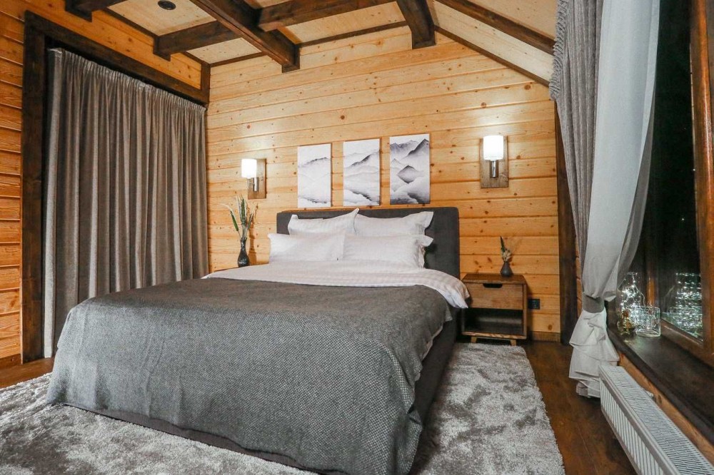 Елементи декору виконані майстрами в одиничному екземплярі. Багато уваги було приділено освітленню. Фасад будинку підсвічений ліхтарями, які виготовлялися на замовлення. Відкритий басейн з підігрівом та чан з видом на ущелину.