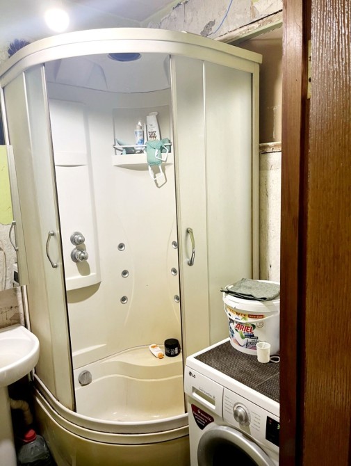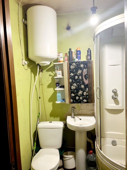 Совмещённый санузел с современной душевой кабиной и бойлером.