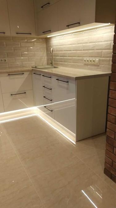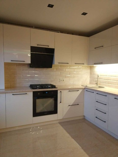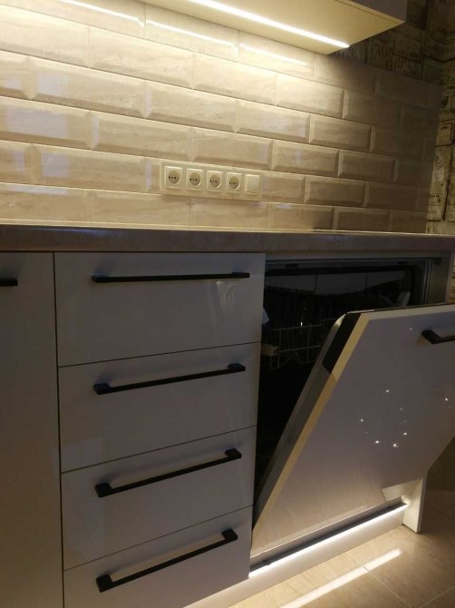 Кухня дорогой акрил, посудомоечная машина, плита, вытяжка, духовой шкаф.