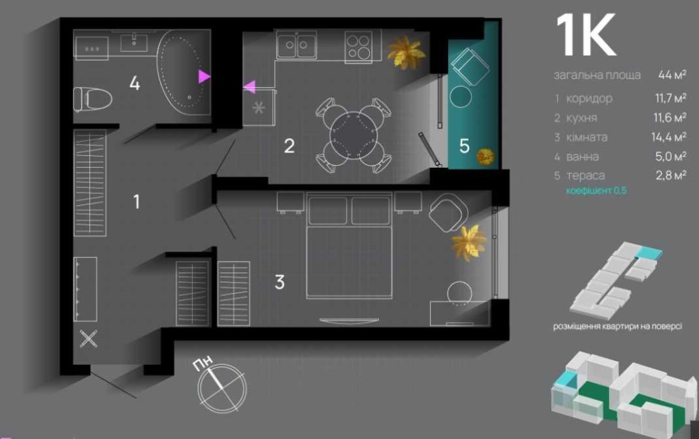 • Общая площадь 44 м2