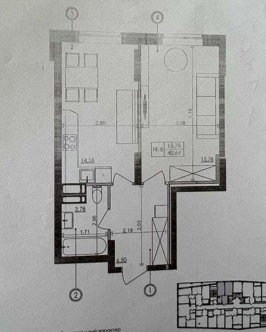 Загальна площа - 40,64 кв.м: кухня 14,58 кв.м, окрема кімната 15,78 кв.м, суміжний санвузол, передпокій.