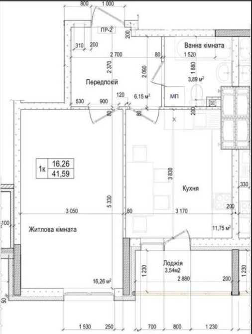 Загальна площа - 42 кв.м, кухня- 12 кв.м.
