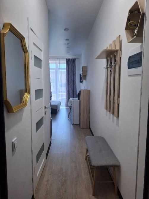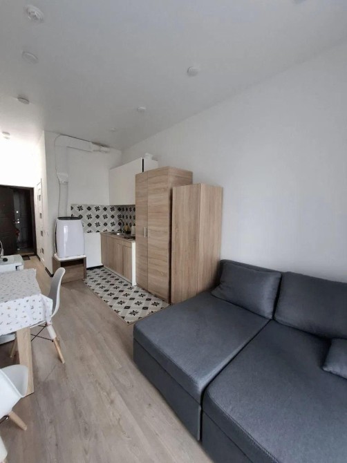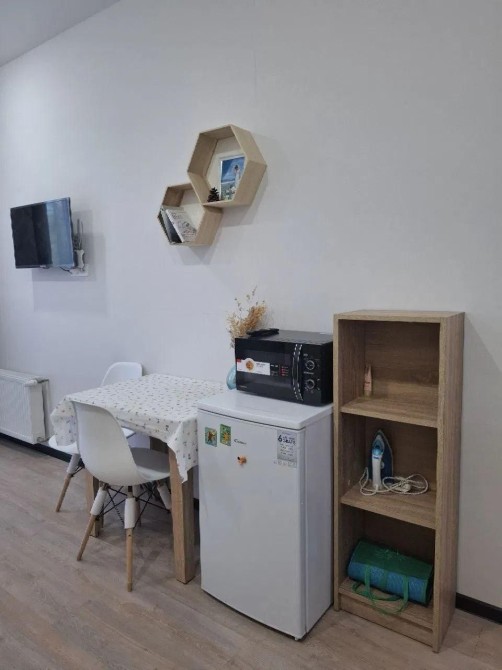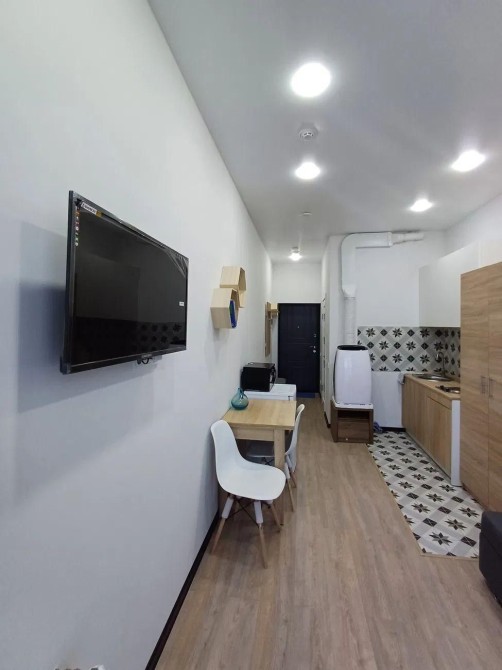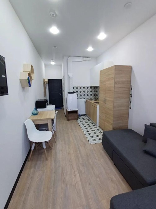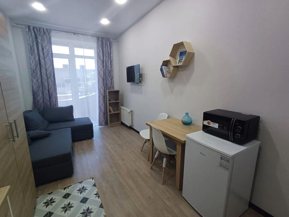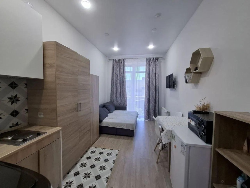 Формат — уютная студия с современным евро-ремонтом, полностью меблированная и оснащённая бытовой техникой: холодильник, варочная панель, микроволновая печь, стиральная машина, телевизор.
