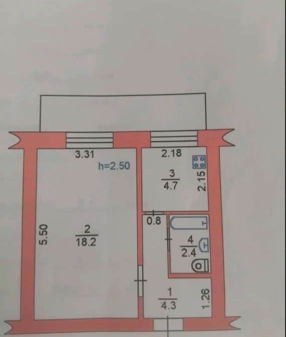 Площадь 31.7м²,комната 18.3².