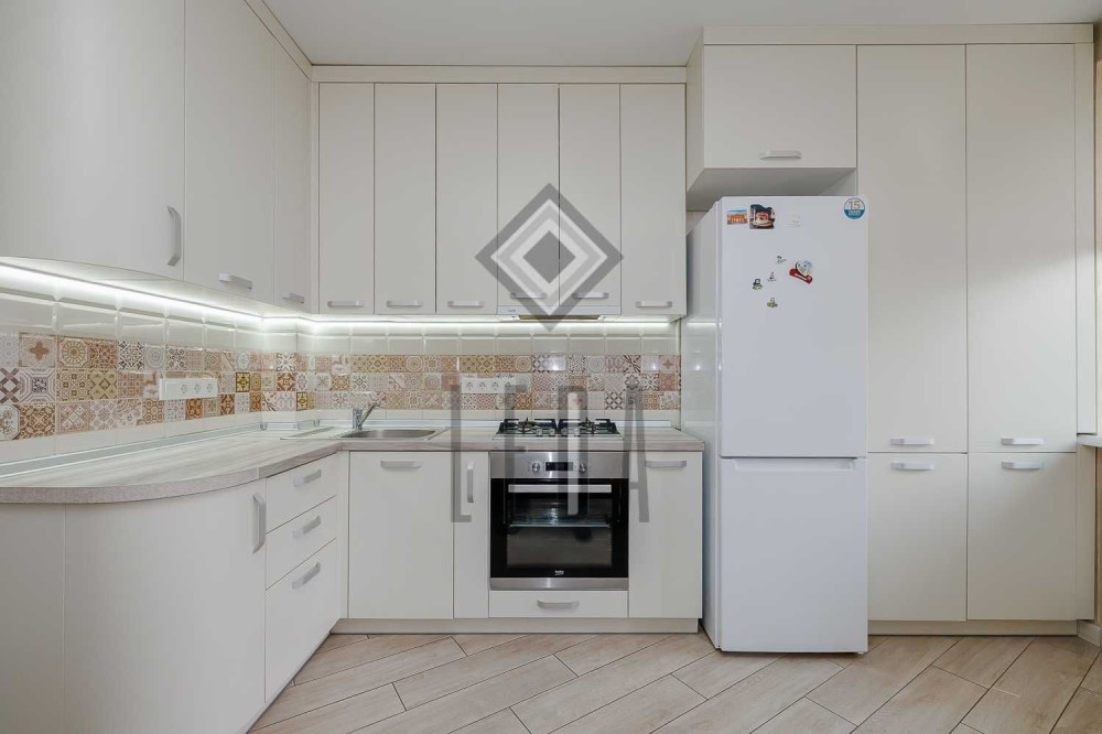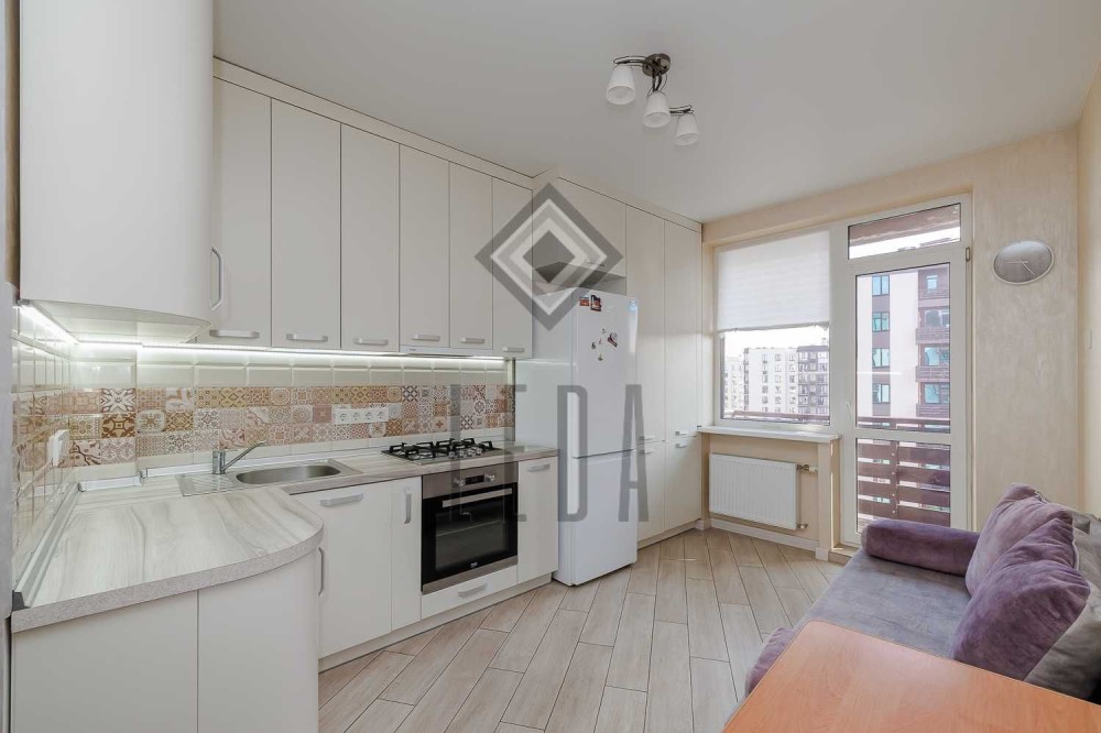 Велика біла кухня має вихід на балкон, з якого видно майже всі цікаві місця в ЖК.