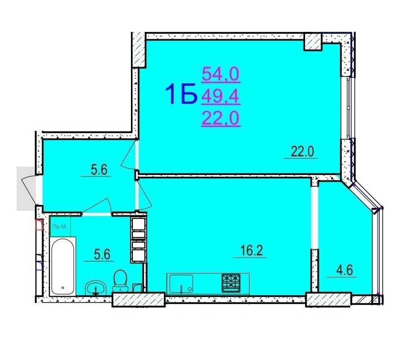 Загальна площа квартири - 54 кв.м., житлова - 22, кухня - 16,2 з виходом на лоджію 4,6 кв.м., с/в сумісний 5,6 кв.м., коридор - 5,6 кв.м.