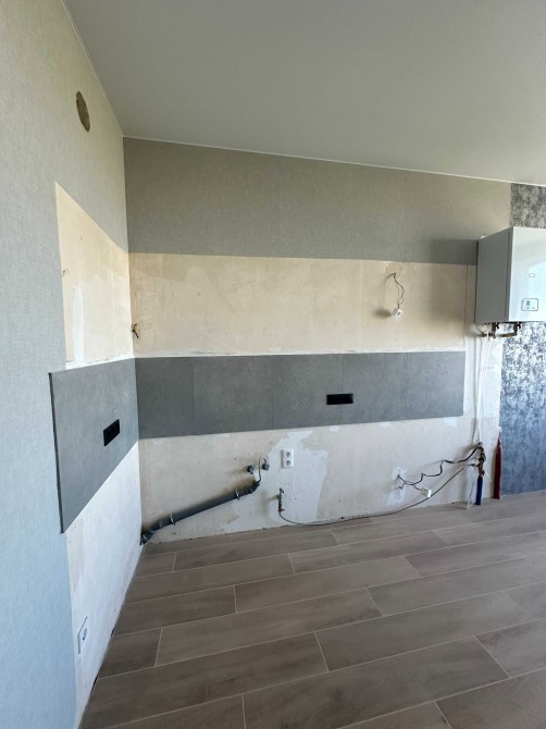 На кухне :полностью сделана разводка воды, фартук, автономное отопление установлен электро-котел