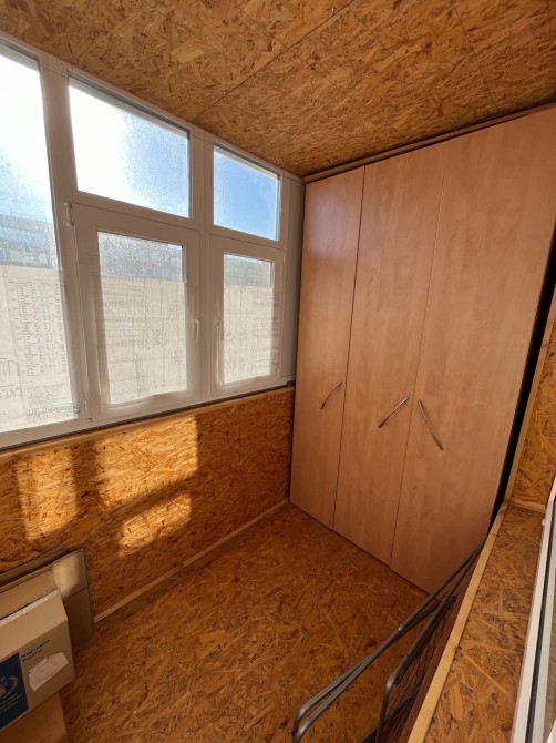 Лоджия застеклена металлопластом. Есть вместительный шкаф.