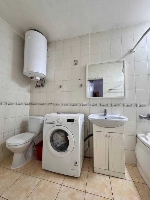 новий унітаз, сучасна плитка, пральна машина