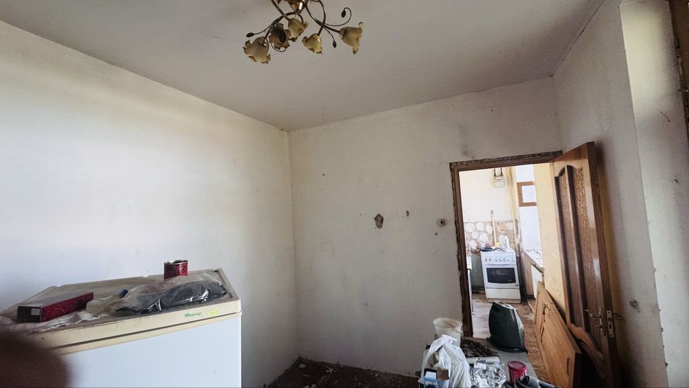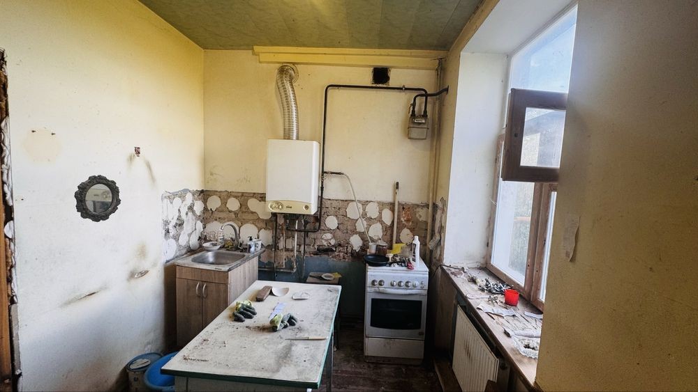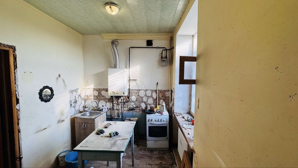 Розпочатий ремонт, тепер потребує поклейки чи фарбування стін, заміни кухні та заміни плитки у ванній кімнаті.