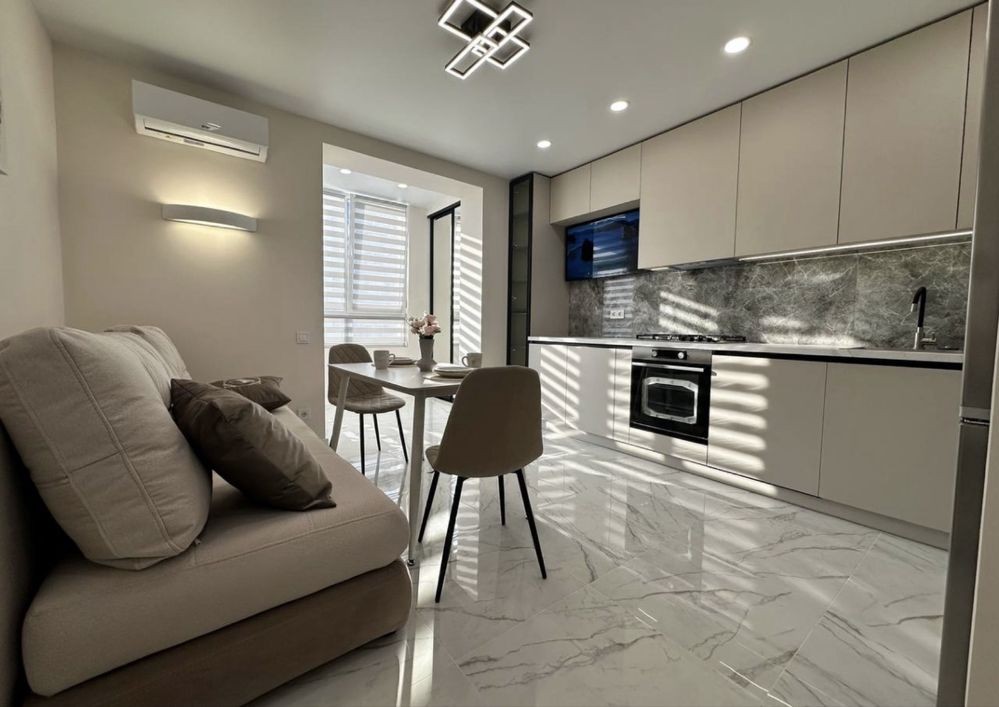 • Уютная гостиная, совмещенная с кухней-студией ( Холодильник, Духовой Шкаф, Микроволновая печь, Посудомойка, Стиральная машина, 2 телевизора, Кондиционер)
